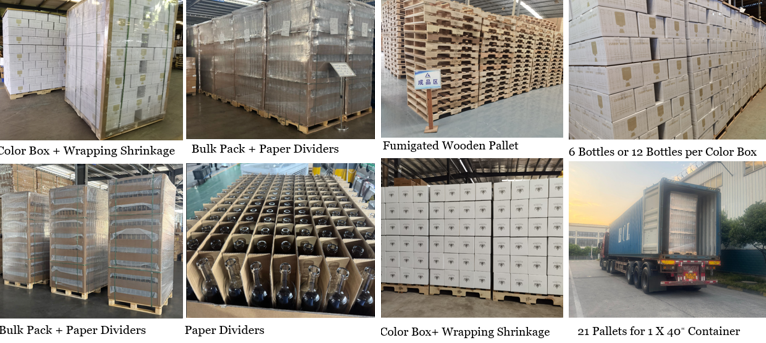 Packing Method : Two Packaging Methods 1. cardboard divider with wooden pallet of plastic shrinkage 2. Colored retail box, usually 6 pcs or 12 pcs bottles boxes which can be reused after bottling and then make it on the wooden pallet with plastic shrinkage